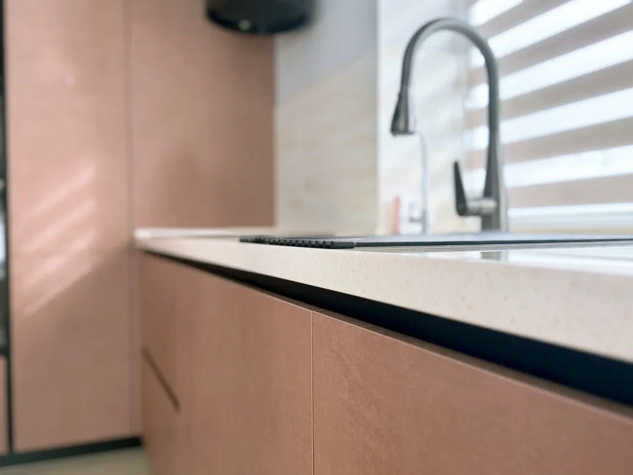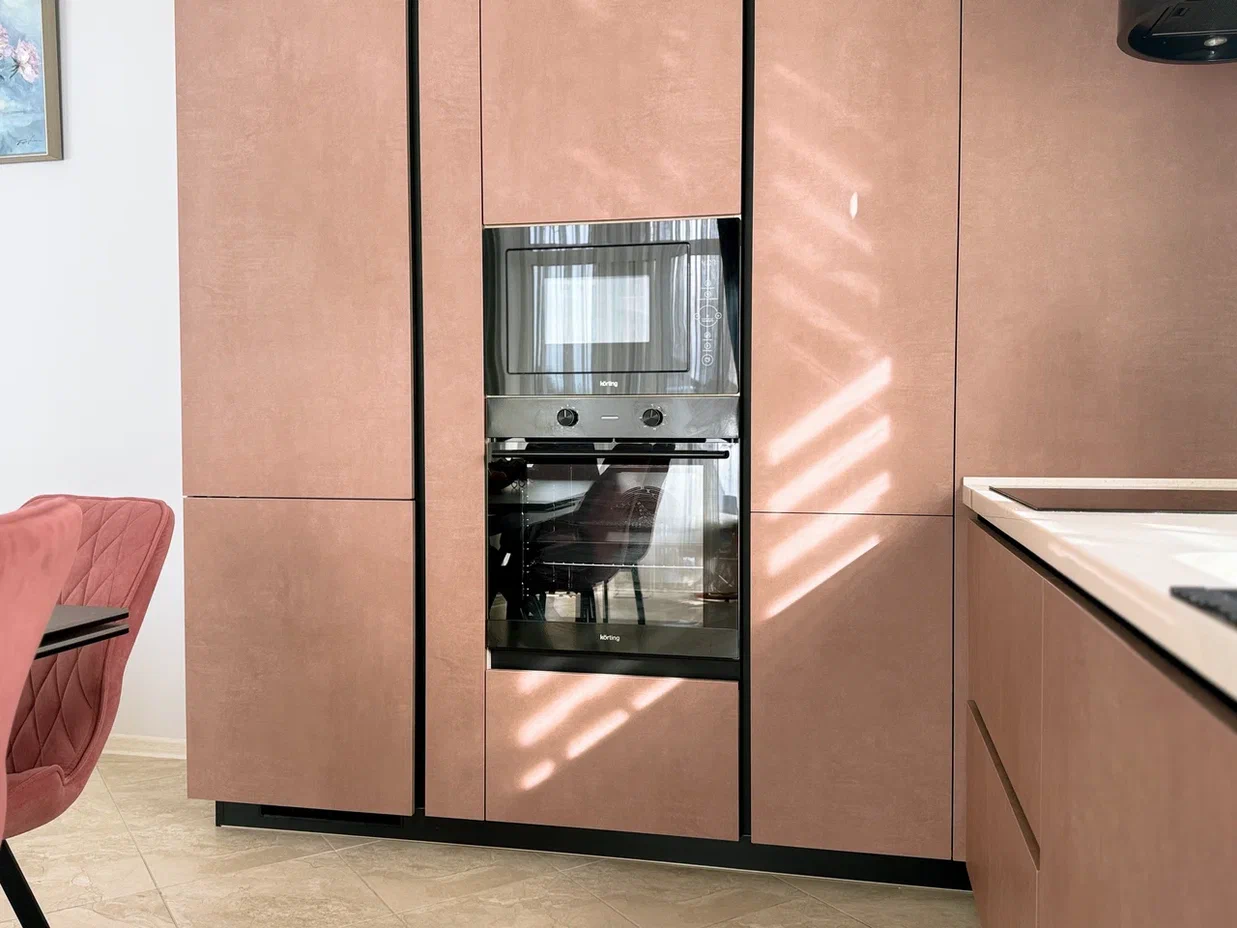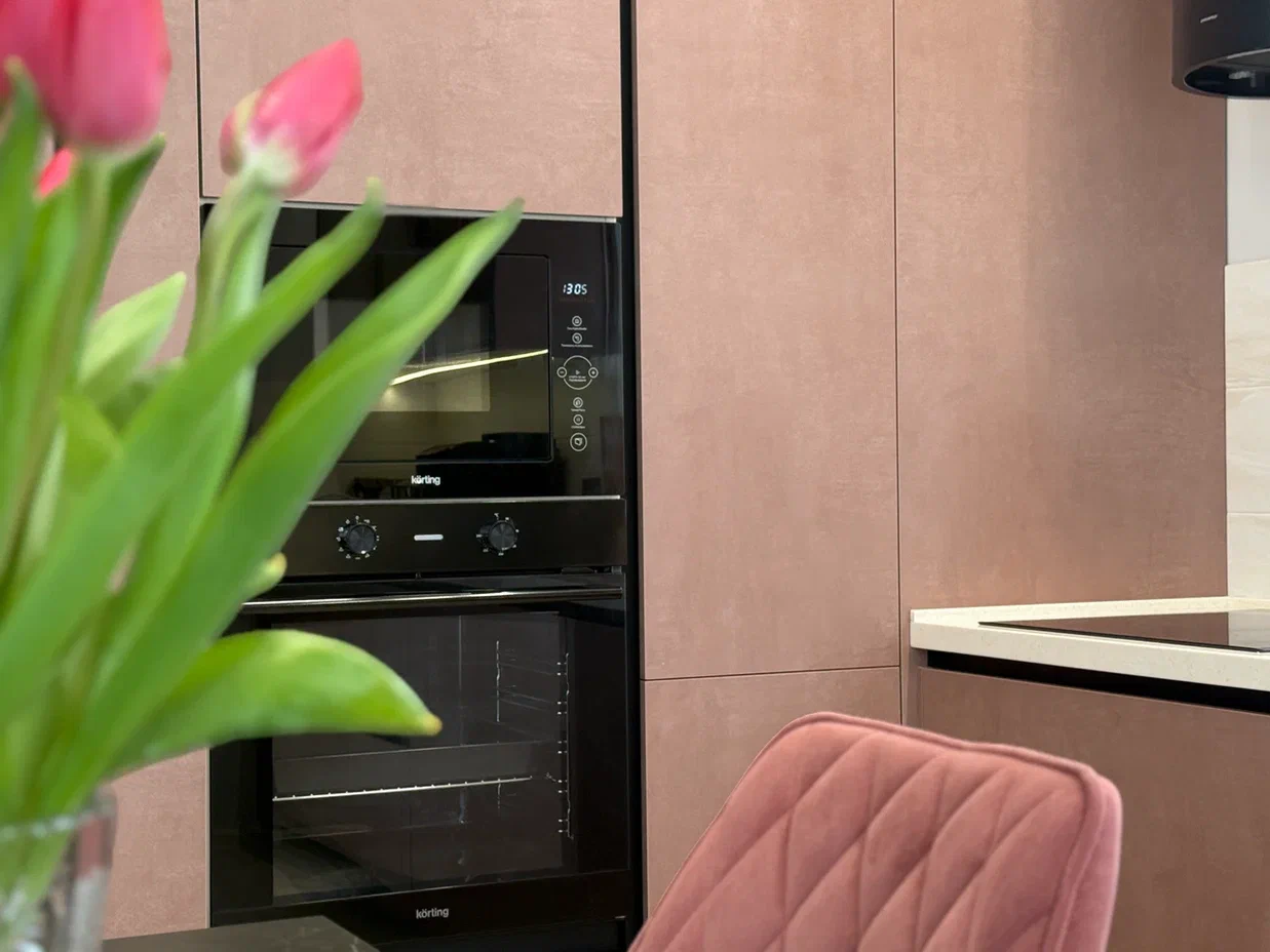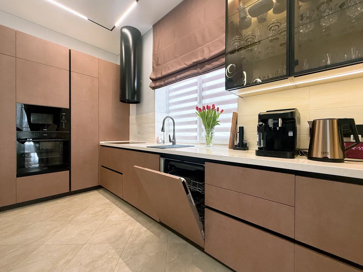 Современная кухня в тёплых терракотовых оттенках с лаконичным дизайном и продуманной эргономикой. Чистые линии фасадов, чёрные акценты и мягкая подсветка создают уютную атмосферу и делают пространство функциональным для ежедневного использования.
