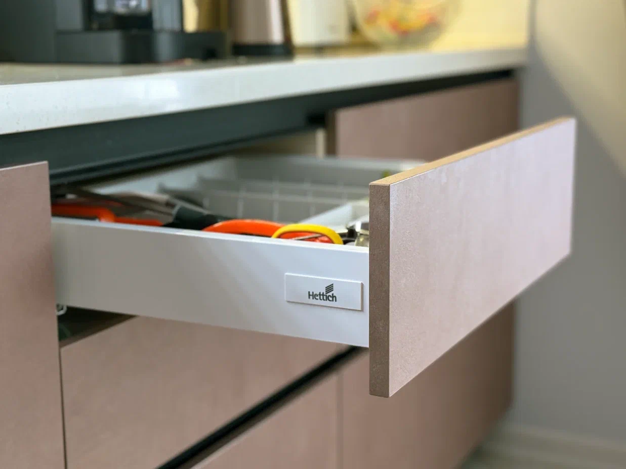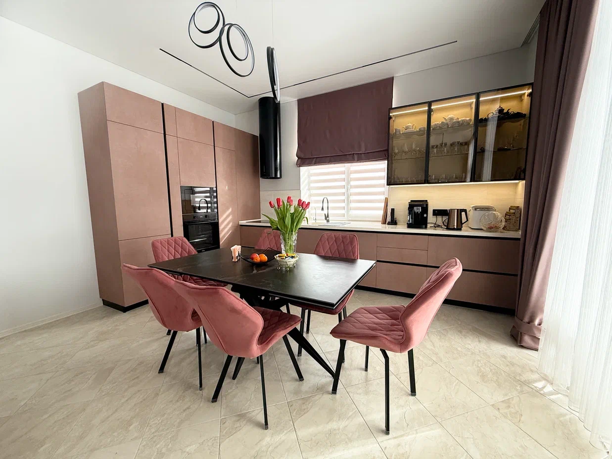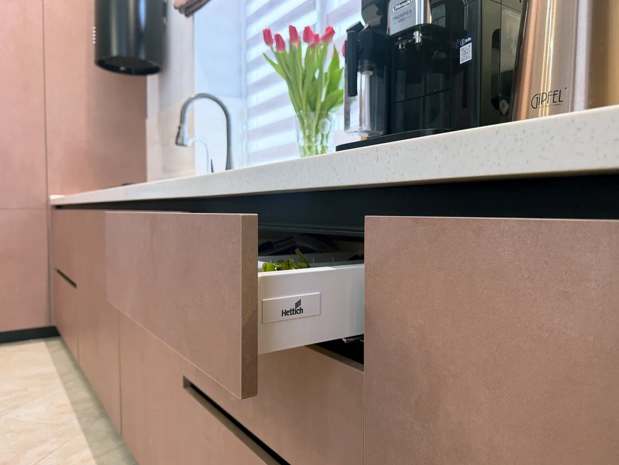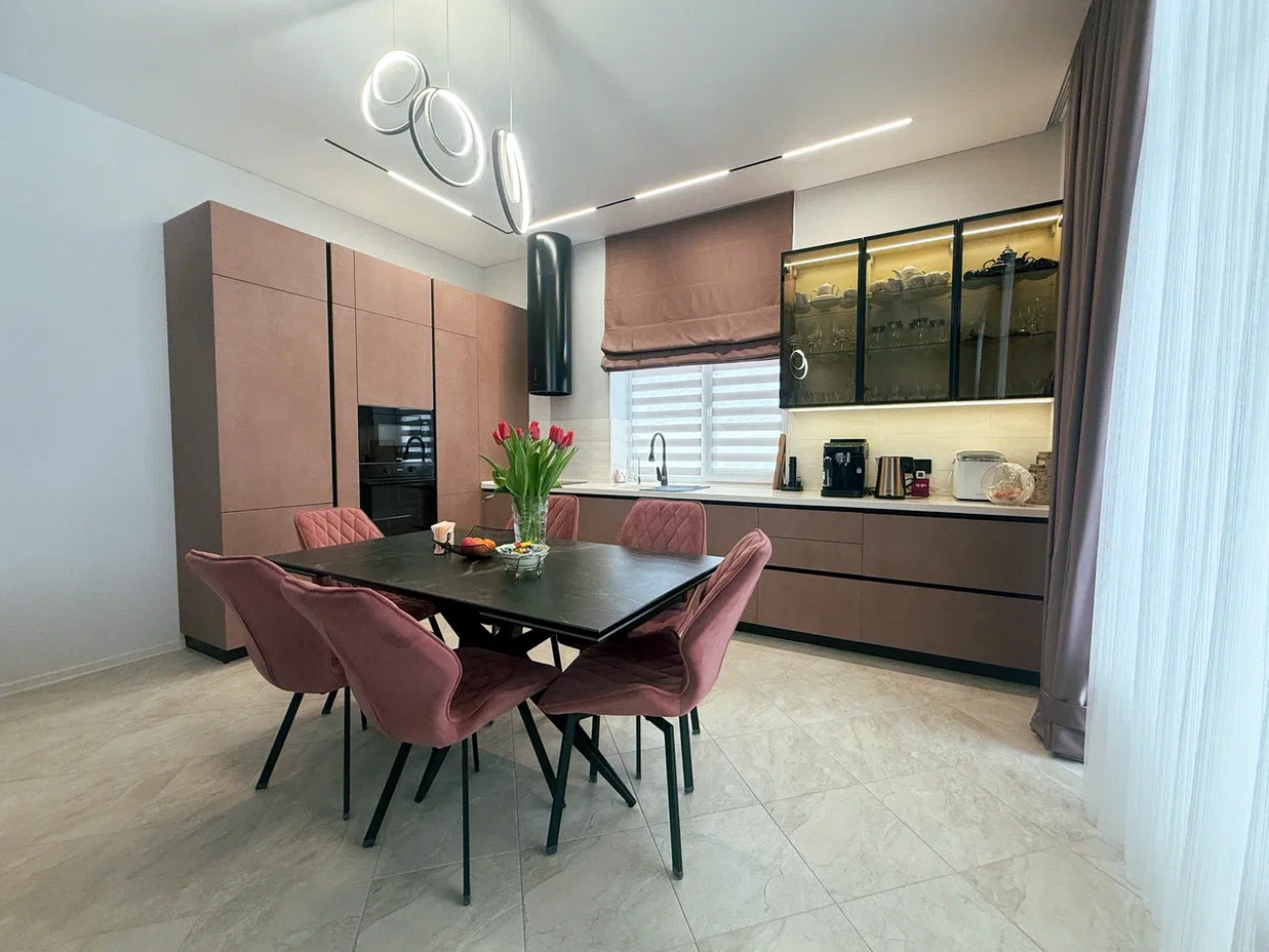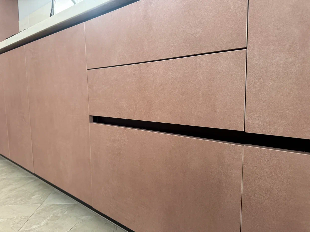 Современная кухня в тёплых терракотовых оттенках с лаконичным дизайном и продуманной эргономикой. Чистые линии фасадов, чёрные акценты и мягкая подсветка создают уютную атмосферу и делают пространство функциональным для ежедневного использования.